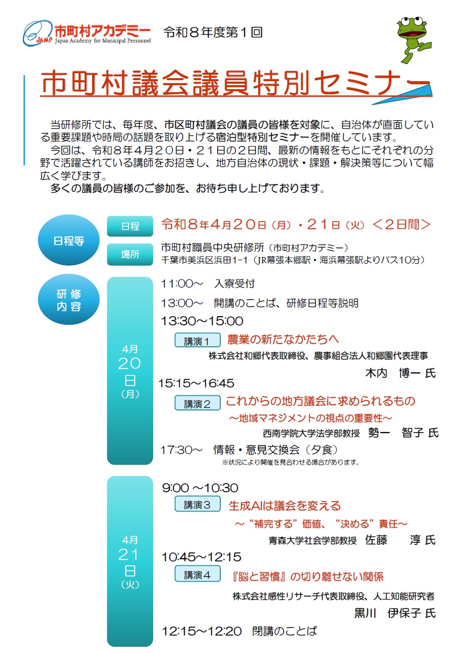 4.20-21は、千葉市美浜区の市町村アカデミーで開催された、市町村議会議員特別セミナーへ議会より派遣、参加。受講者名簿では134人。議会事務局へ提出した報告内容を掲載する。