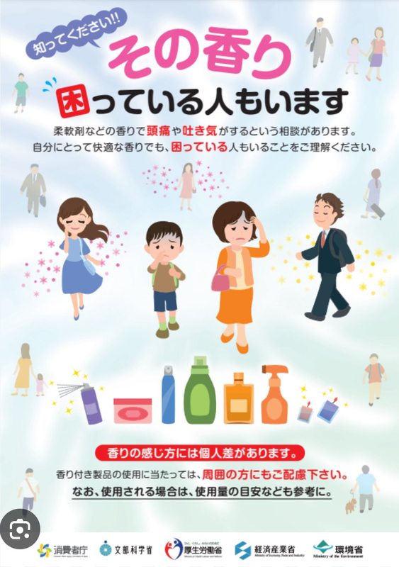 また全国でもこの動きは加速しており、世田谷区や札幌市ではポスター掲示や学校での啓発が行われており、国会議員も洗剤や柔軟剤について取り上げており、国の5省庁も「その香り、困っている人もいます」という啓発ポスターを作成しました。