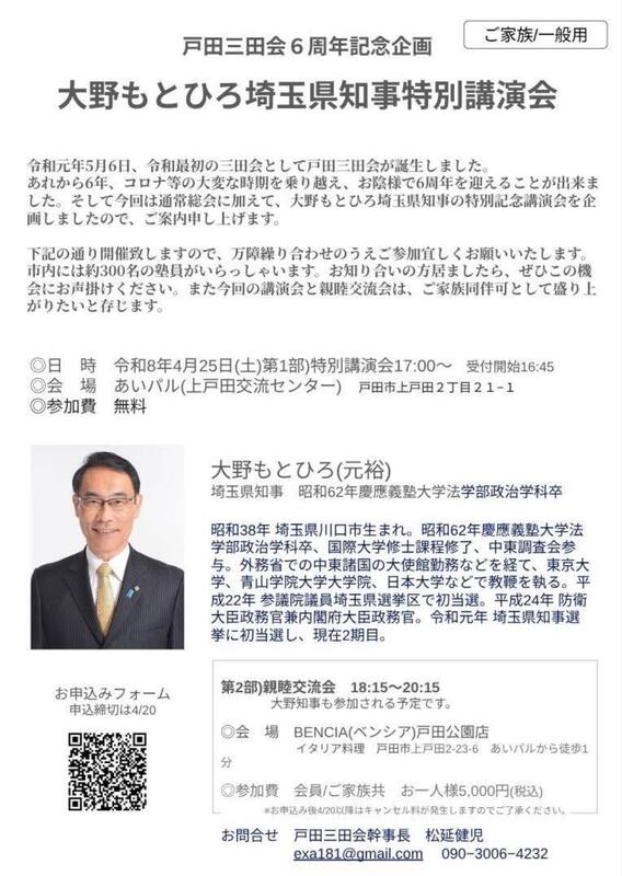【お知らせ|戸田三田会6周年記念企画(埼玉県戸田市)】〈大野もとひろ埼玉県知事 特別講演会〉