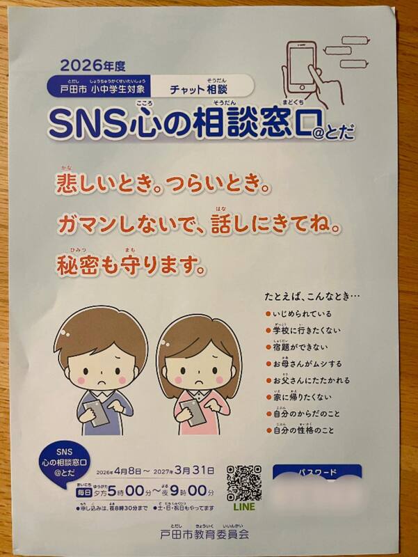 我が家でも学校から「SNS心の相談窓口@とだ」のチラシをもらってきました。