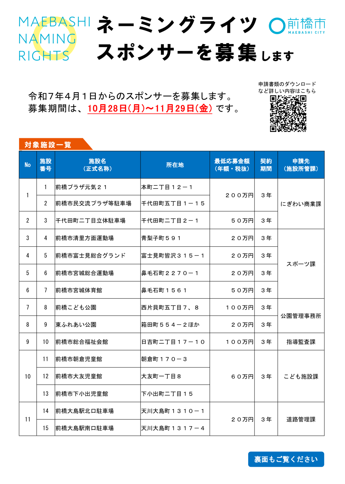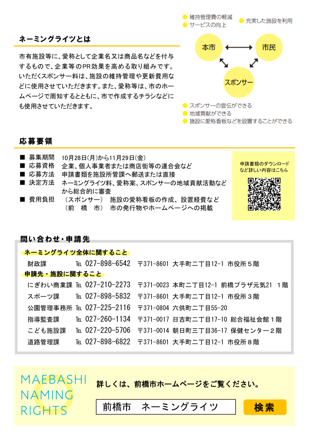 前橋市市有施設のネーミングライツスポンサーの募集を10月28日(月)から11月29日(金)まで実施します。