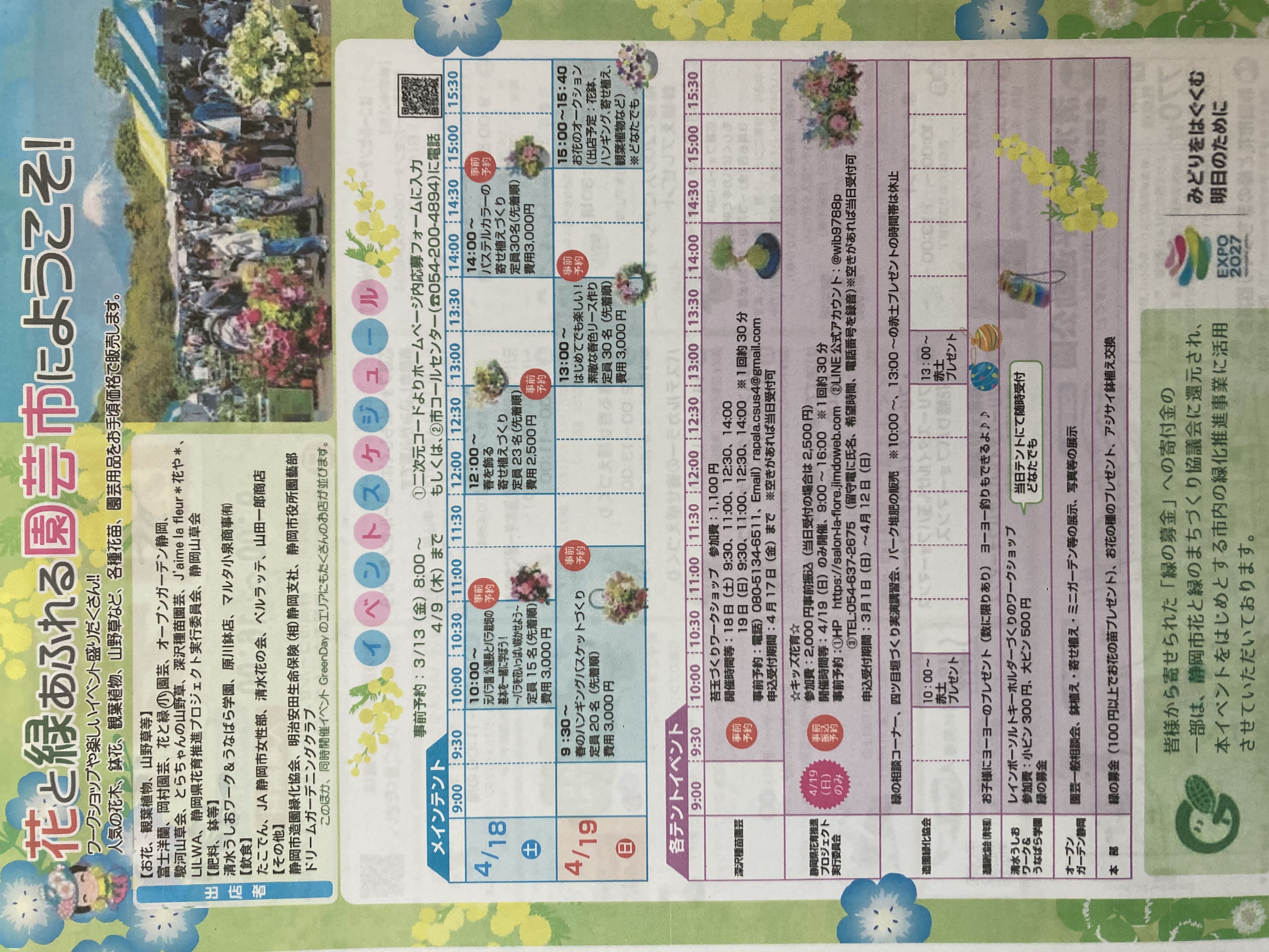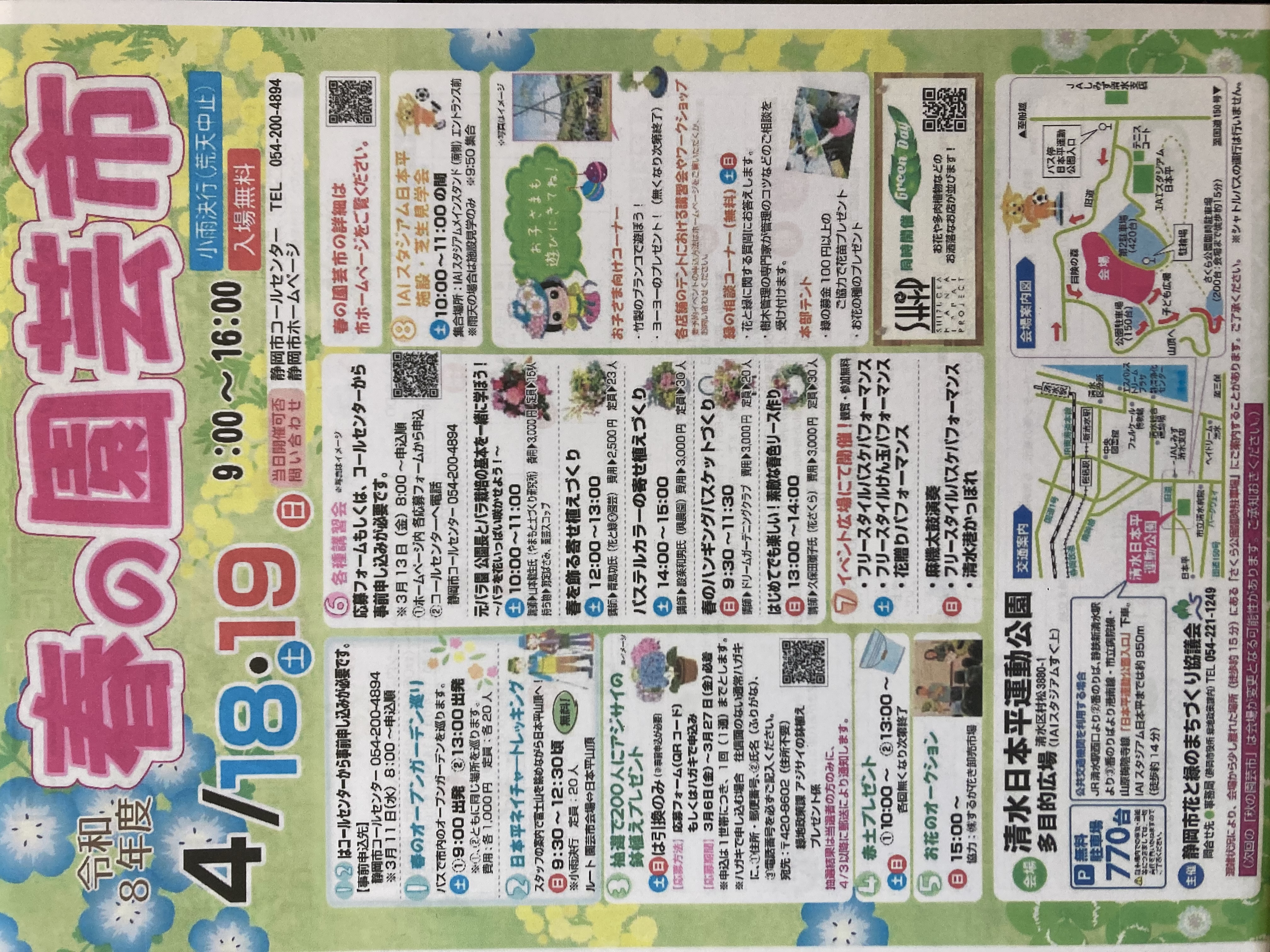 4/18(土)19(日)の9時から16時に春の園芸市が清水日本平運動公園で開催されます。園芸関連以外にも、4/18の10時からIAIスタジアム日本平の施設や芝生見学会(9:50集合)、4/19の9時半からネイチャートレッキング(定員20人)などもあります。無料駐車場が770台ありますので、興味ある方は写真のチラシをご覧ください。