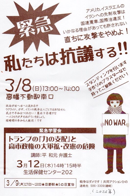 ホーム>政党・政治家>わたなべ 三枝 (ワタナベ ミツエ)>今日は高幡不動駅にて、アメリカ、イスラエルのイランへの先制攻撃は国連憲章、国際法違反!いかなる...