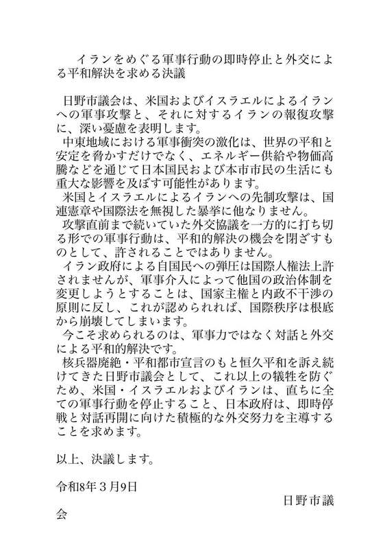 イランをめぐる軍事行動の即時停止と外交による平和解決を求める決議」が全会一致で可決されました。