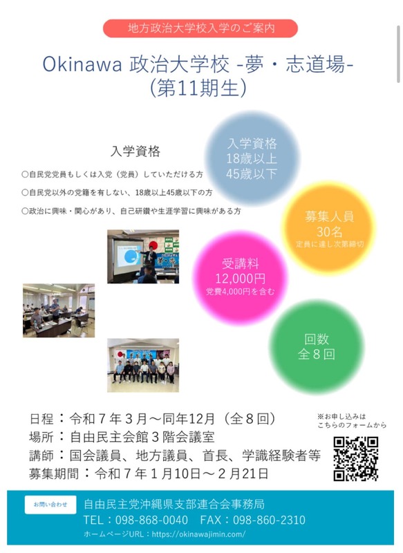 そして、令和7年3月~12月に開講予定の 「Okinawa政治大学校 ー夢・志道場ー」 では、第11期生を募集いたします。