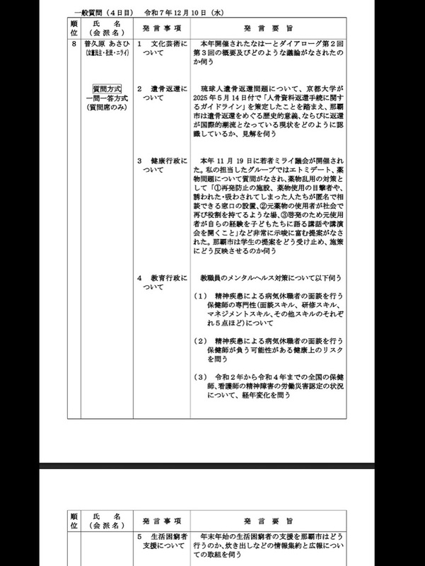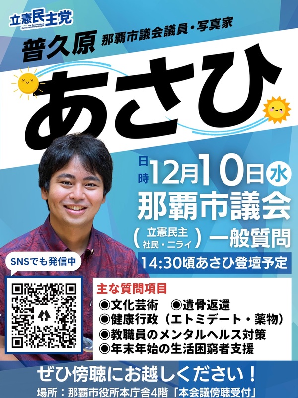 ホーム>政党・政治家>普久原 あさひ (フクハラ アサヒ)>明日(12/10)14時30分ごろから一般質問を行います🙋🏻テーマは、文化芸術、エトミデート・...
