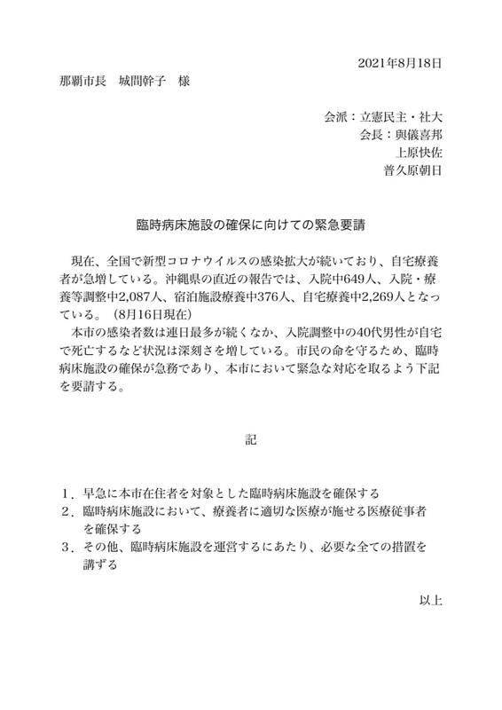 ホーム>政党・政治家>普久原 あさひ (フクハラ アサヒ)>本日夕方、那覇市長に、臨時病床施設の確保に向けての会派要請をしてきました。