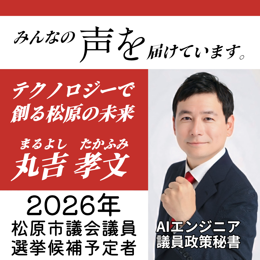 ホーム>政党・政治家>丸吉 孝文 (マルヨシ タカフミ)>【松原市会議員選挙2026候補予定者】国の動きを即、松原の力に。AIで加速する「攻めの行政」