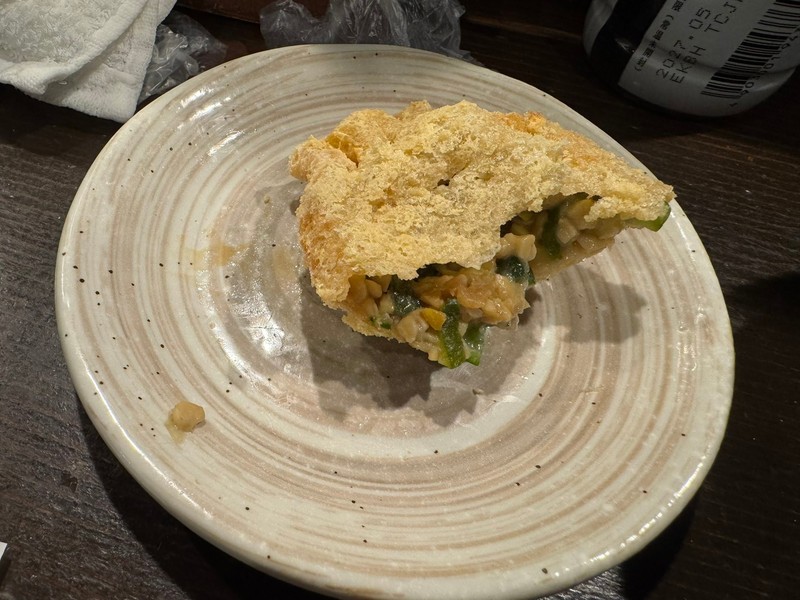 外側はてんぷらみたいにカラッと揚がってます。内側は、ひき納豆刻みネギあえでちょうど良くフワッとしています。