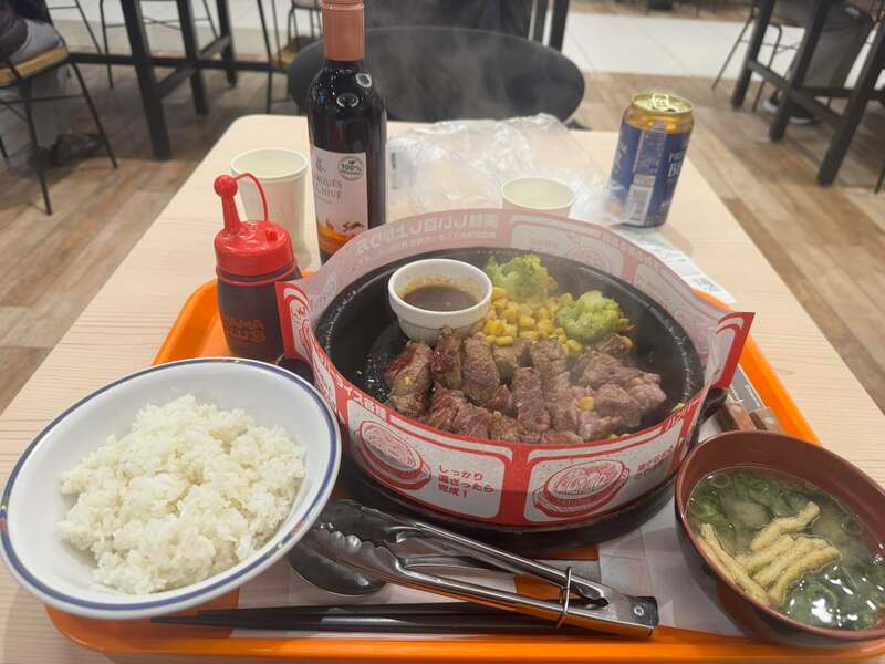 今日は、一人イオンフードコートステーキパーティ。贅沢な気分に浸っている。ワインが美味い。