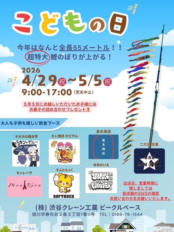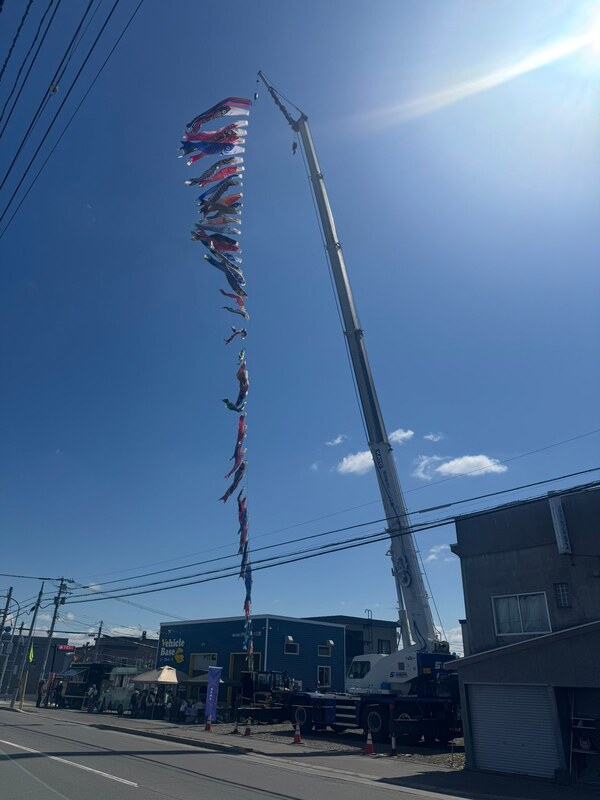旭川市春光台の恒例鯉のぼり。今年はより大きな鯉が泳いでいます。渋谷クレーン工業ビーグルベースの渋谷夫妻の想いが込められた素敵な機会です。