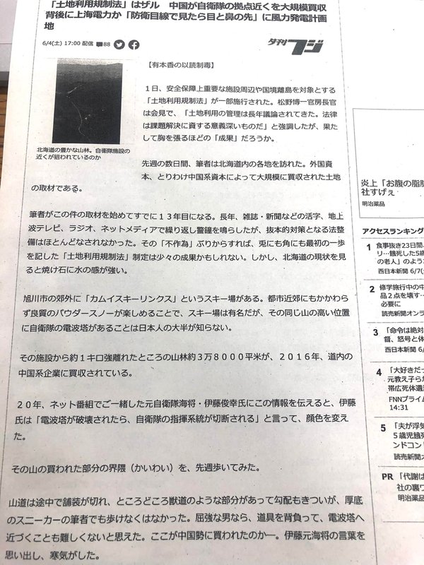 旭川カムイスキーリンクス脇に、稚内からの電波を繋ぐ安全保障上重要な電波塔があります。そのすぐ近くの中国資本に買収された土地について、同地の開発制限解除を某政治家が働きかけているのではとの市民からの問題提起がありました。