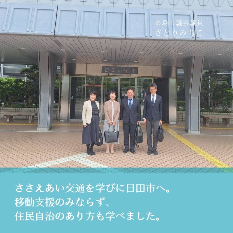 ホーム>政党・政治家>さとう みちこ (サトウ ミチコ)>【ささえあい交通を学びに、大分県日田市へ】糸島市でも、さまざまな公共交通の取り組みが進められて...