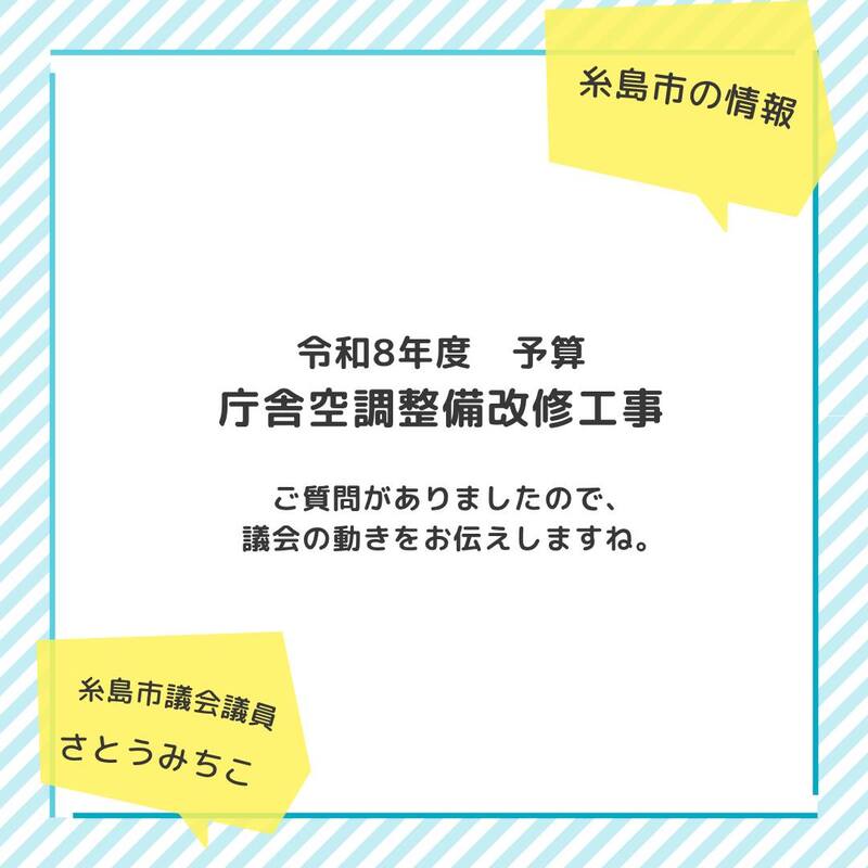 ホーム>政党・政治家>さとう みちこ (サトウ ミチコ)>【糸島市庁舎 空調設備改修工事について】ご心配の声がありましたので、議会での動きを簡単ではあり...