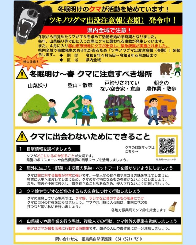 4月26日、桜本字会沢地内において、山菜採りで入山された方がクマに襲われる事案がありました。