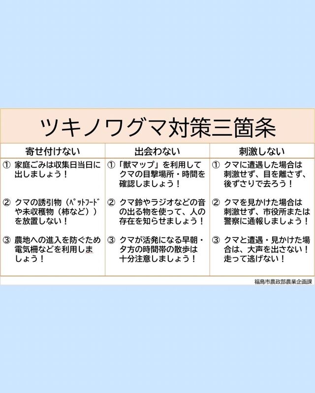 このことを受け、市民の皆さまにわかりやすく備えていただけるよう、ツキノワグマ対策を「三箇条」として新たにまとめました。