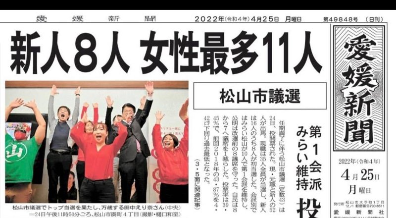 松山市議会議員選挙2022年、8,836票を頂戴し、当選させていただきました。