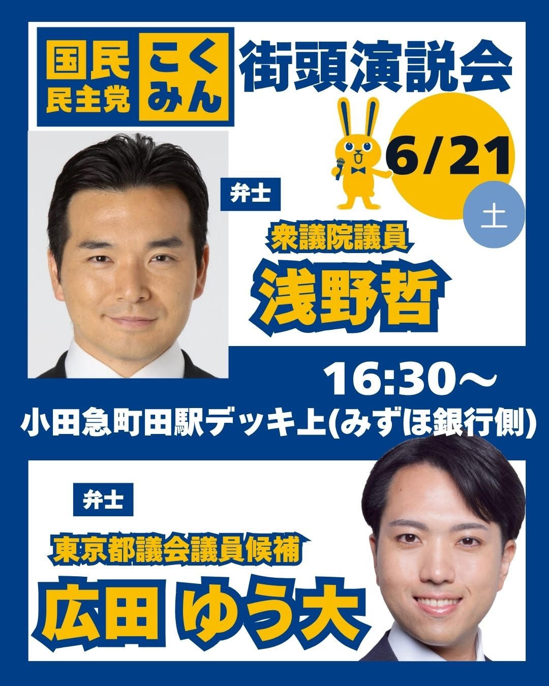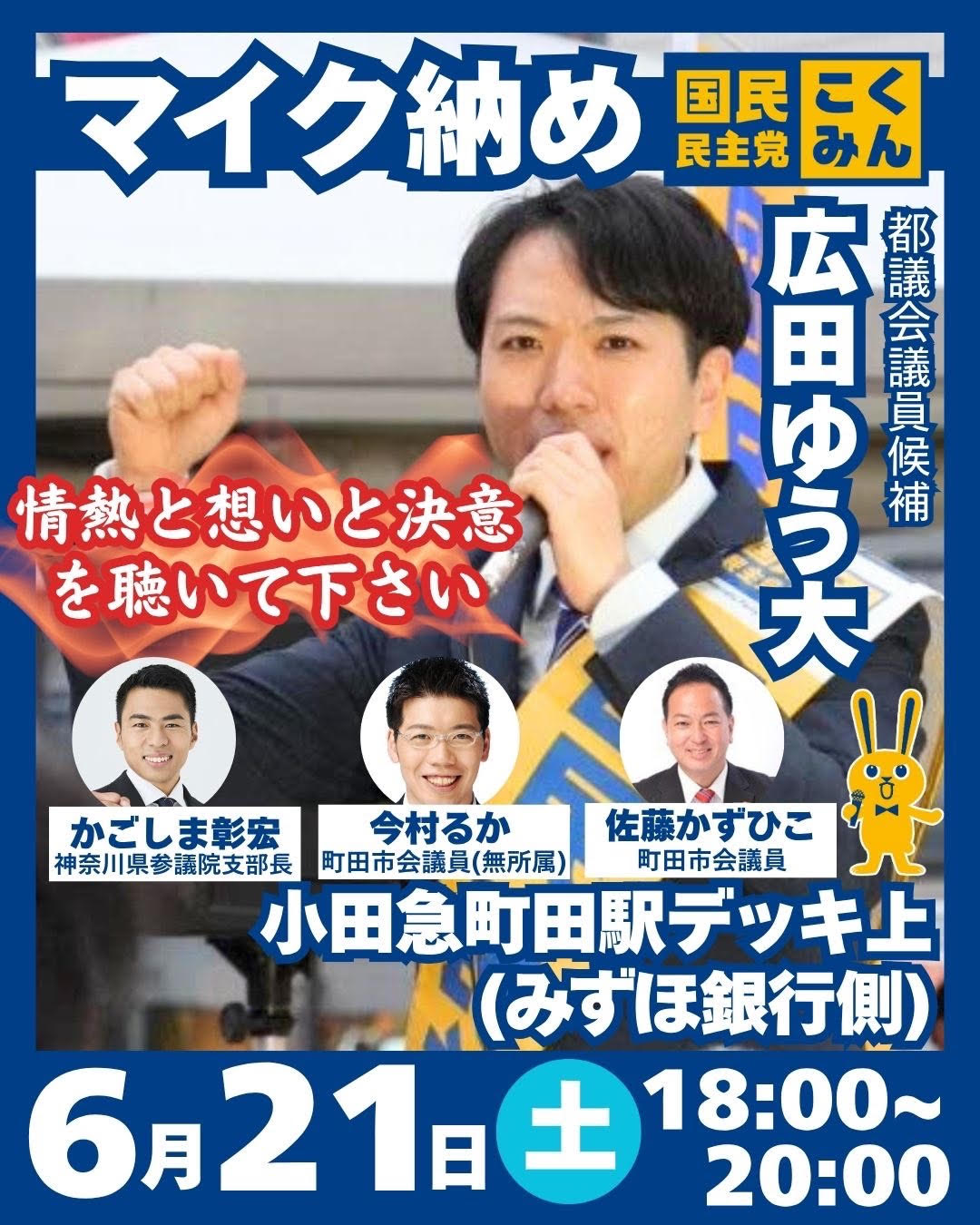 ホーム>政党・政治家>広田 ゆう大 (ヒロタ ユウダイ)>小田急町田駅デッキ上(みずほ銀行側)16時半〜応援、18時〜マイク納め!22時〜youtube対談