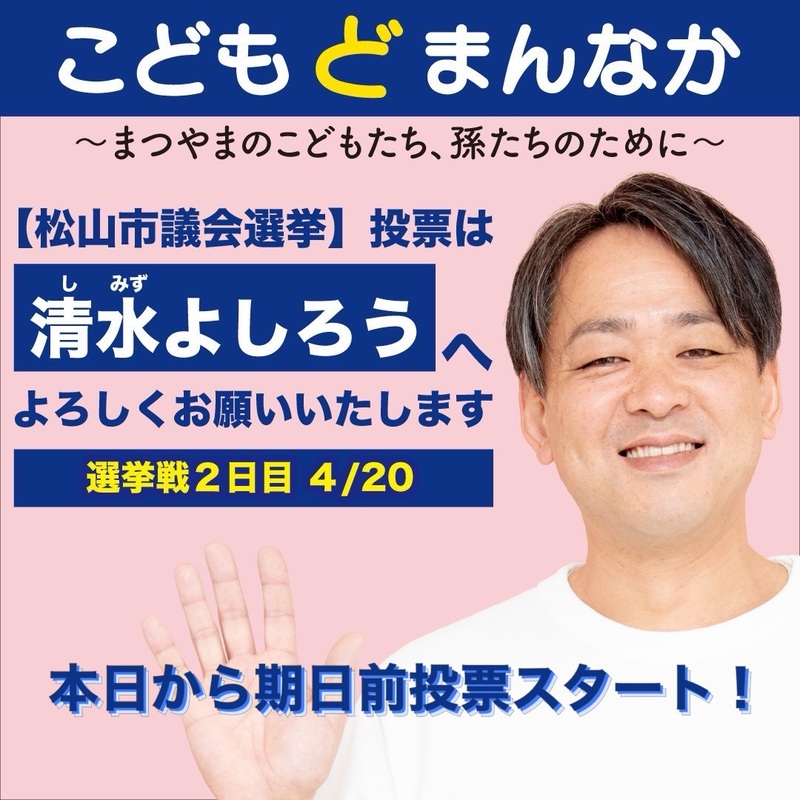 ホーム>政党・政治家>清水 よしろう (シミズ ヨシロウ)>【期日前投票スタート!】本日から松山市議会議員選挙、期日前投票がスタートしました✋皆様の尊き一...