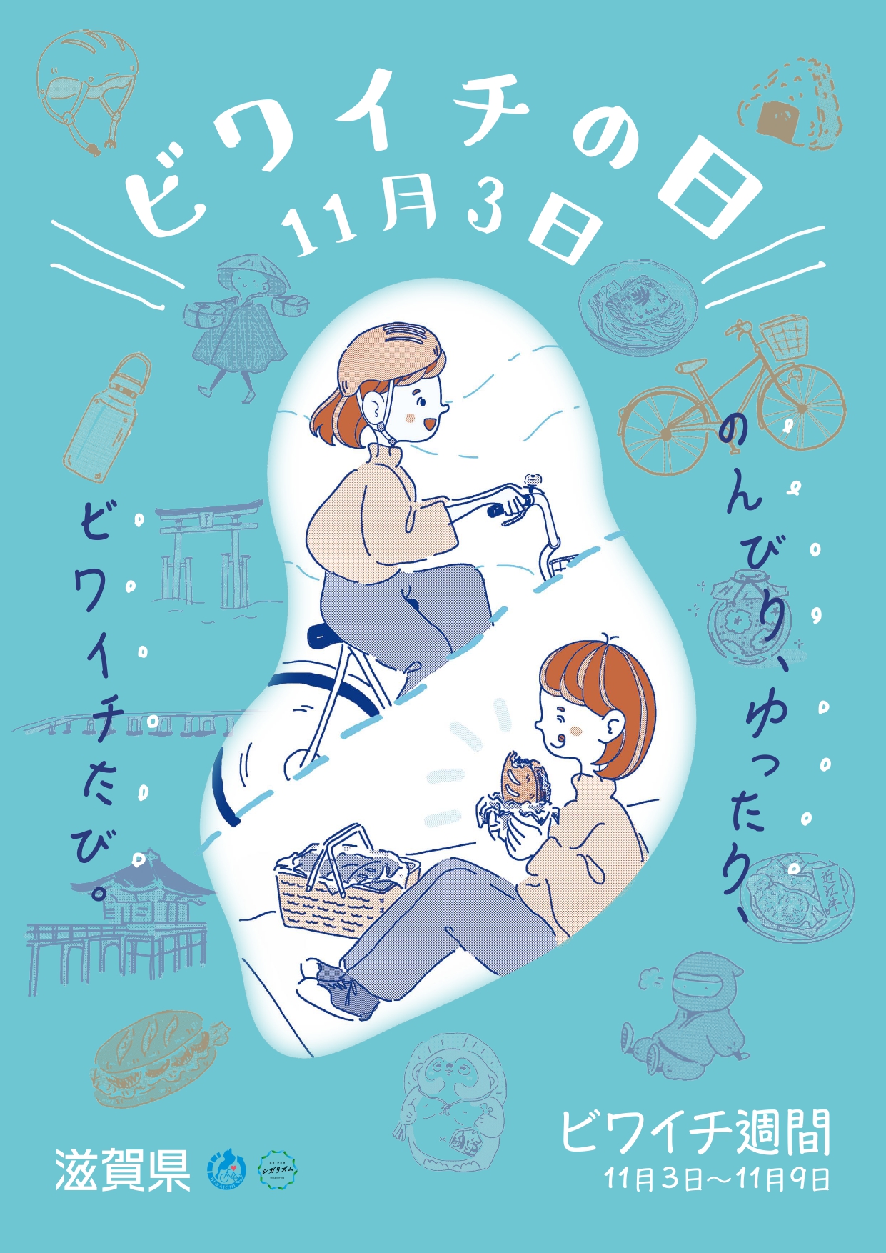 滋賀県では県民の皆さん、関係者の皆さんに広くビワイチについて関心と理解を深めていただくとともに、ビワイチの意欲を高め、愛着と誇りを育んでいただくため、11月3日(いいサイクリング)を「ビワイチの日」、3日から9日までを「ビワイチ週間」と定めました。