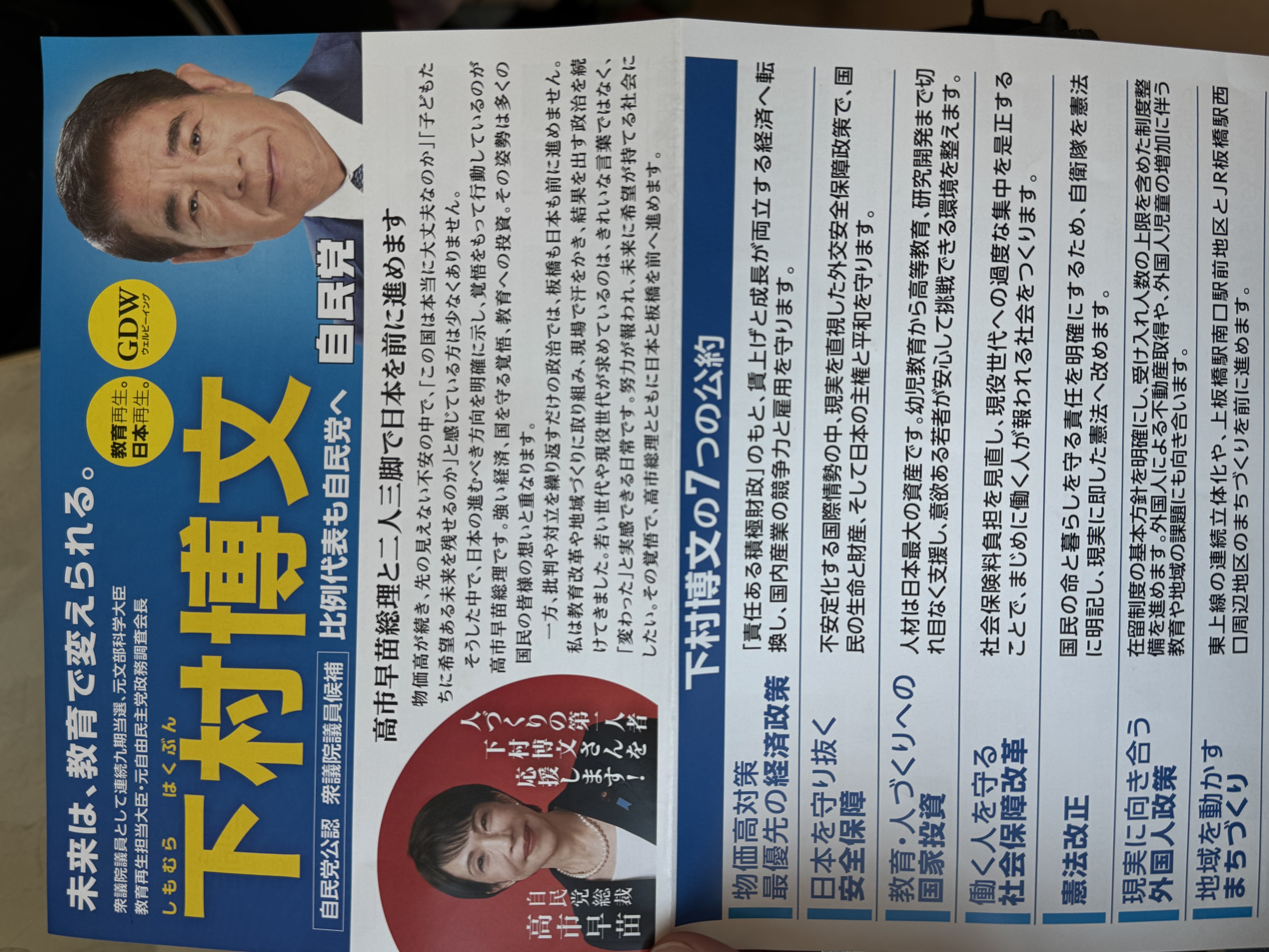 選挙区(板橋区の一部)の投票用紙には「下村博文」とお書きください。