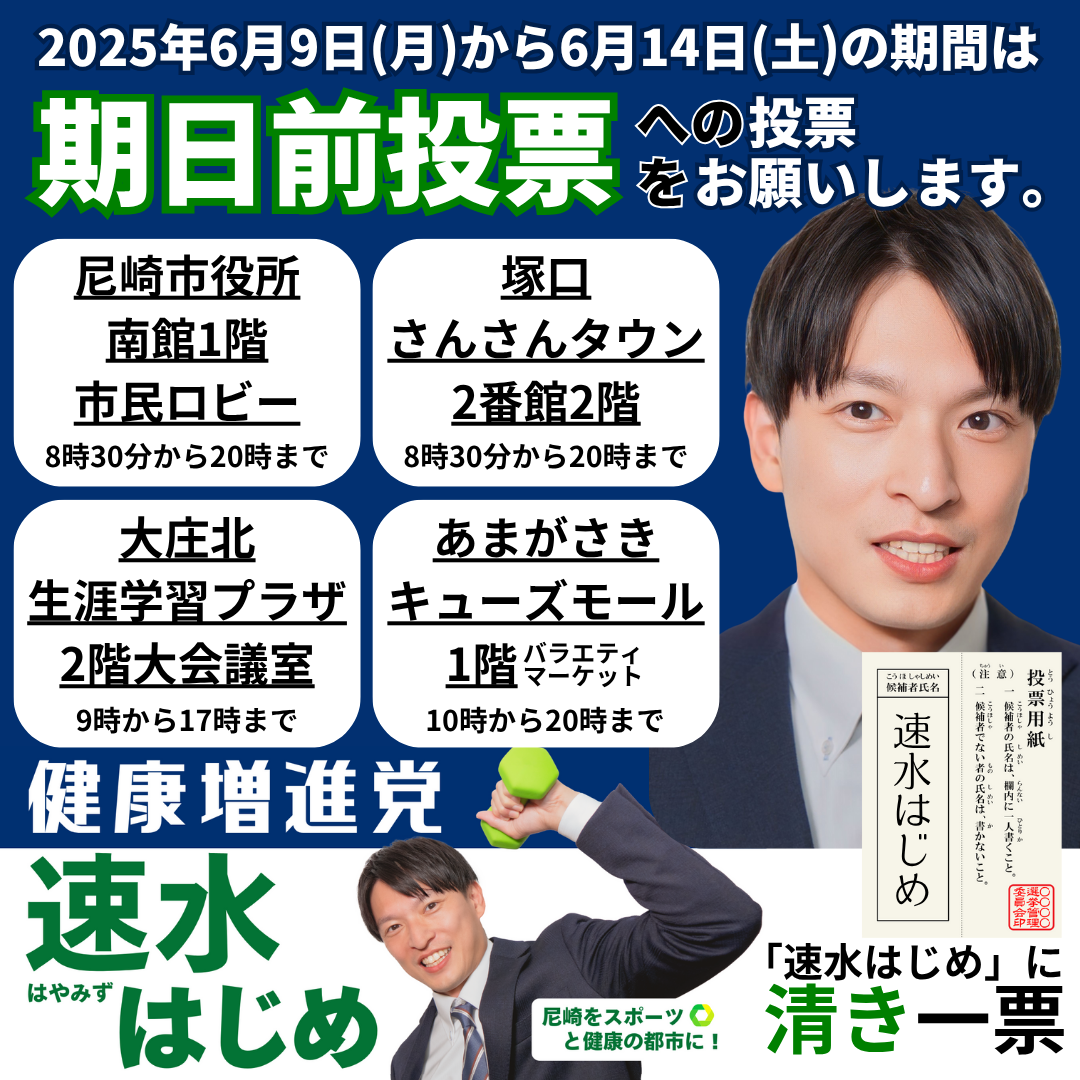 尼崎市議会議員選挙2025の候補者。40歳。尼崎をスポーツと健康の都市に!健康増進党の速水はじめです。日本社会の未来のために健康になる!この意識を育むことが大事です。増え続ける医療費の問題に立ち向かうため、尼崎市議会議員選挙2025に立候補しました。