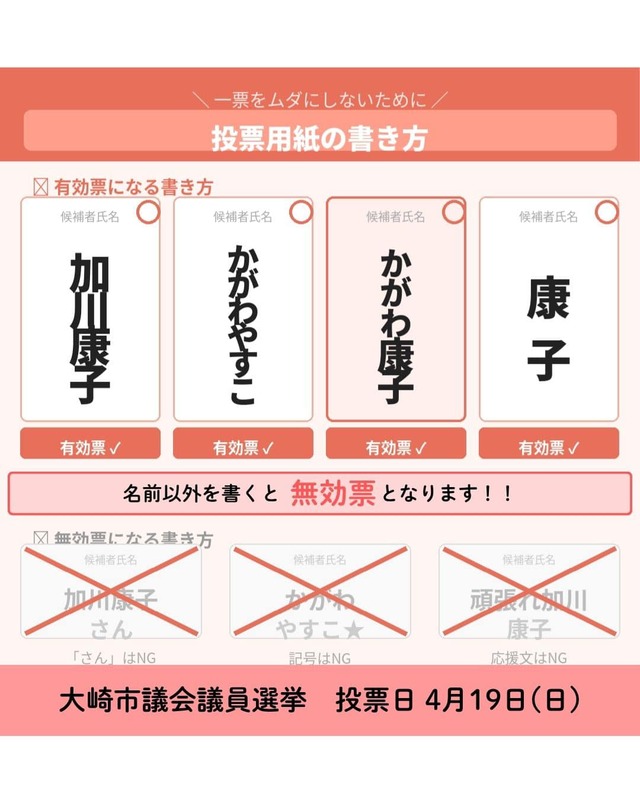 ホーム>政党・政治家>かがわ 康子 (カガワ ヤスコ)>投票用紙に名前以外を書くと無効となります。