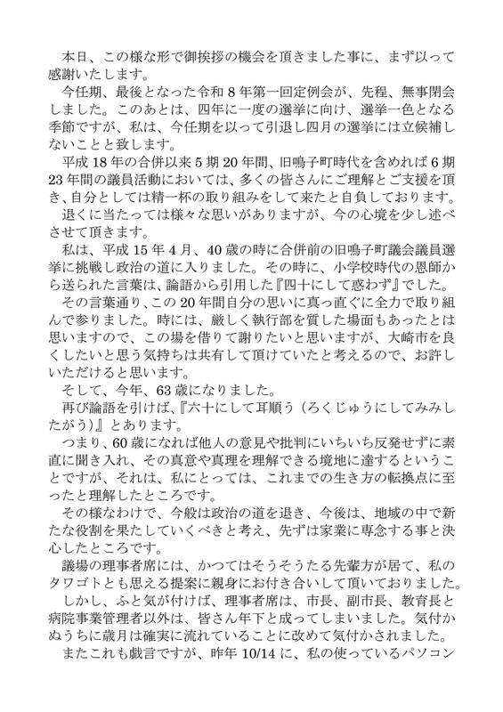 中鉢和三郎議員をはじめ、引退される先輩方から、初当選直後よりご指導いただきました。 私の疑問や意見等について、なぜ疑問なのか、なぜそう考えるのか?を否定せず、丁寧に聞いていただきました。 そして意見交換、議論させていただきました。 誠にありがとうございました。