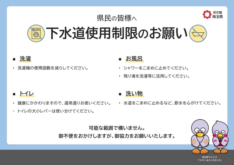 蓮田市では、現在も下水道使用制限が続いております。