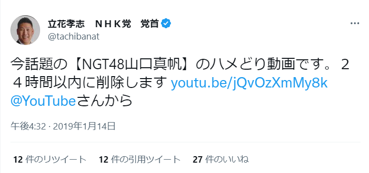 2019年1月14日、孝志は「今話題の【NGT48山口真帆】のハメどり動画です。24時間以内に削除します」とツイートとして大炎上した。