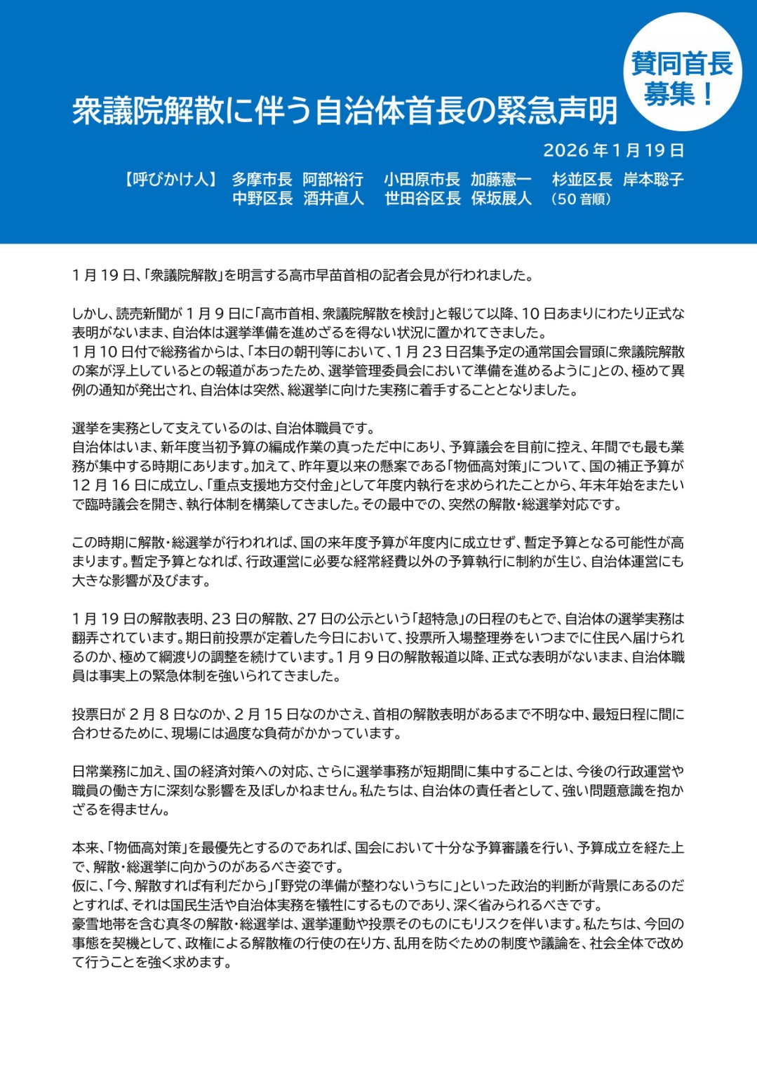 ホーム>政党・政治家>岸本 さとこ (キシモト サトコ)>【賛同を呼びかけます】衆議院解散に伴う自治体首長の緊急声明