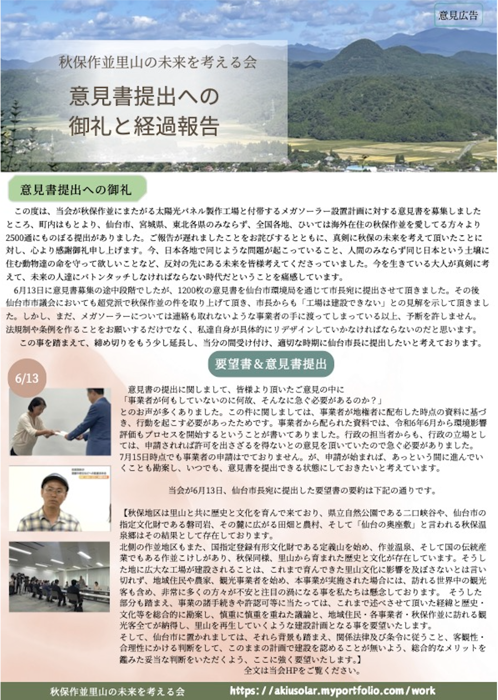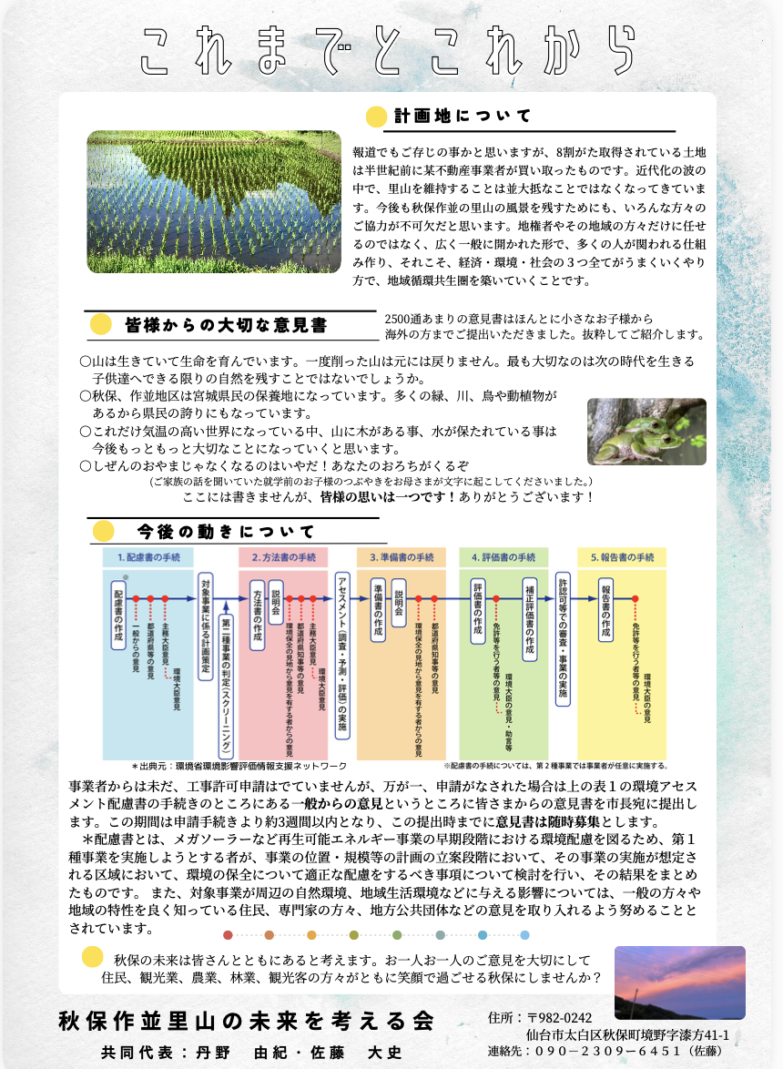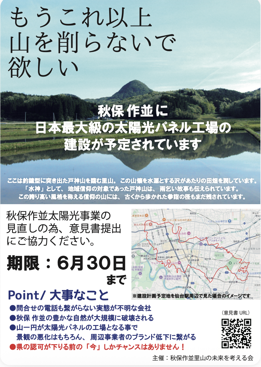 ② 意見書募集開始:これを受けて地元の仲間たちと「秋保作並里山の未来の考える会」(共同代表 丹野由紀・佐藤大史)を立ち上げ、この太陽光事業の見直しの為、意見書を広く募りました。