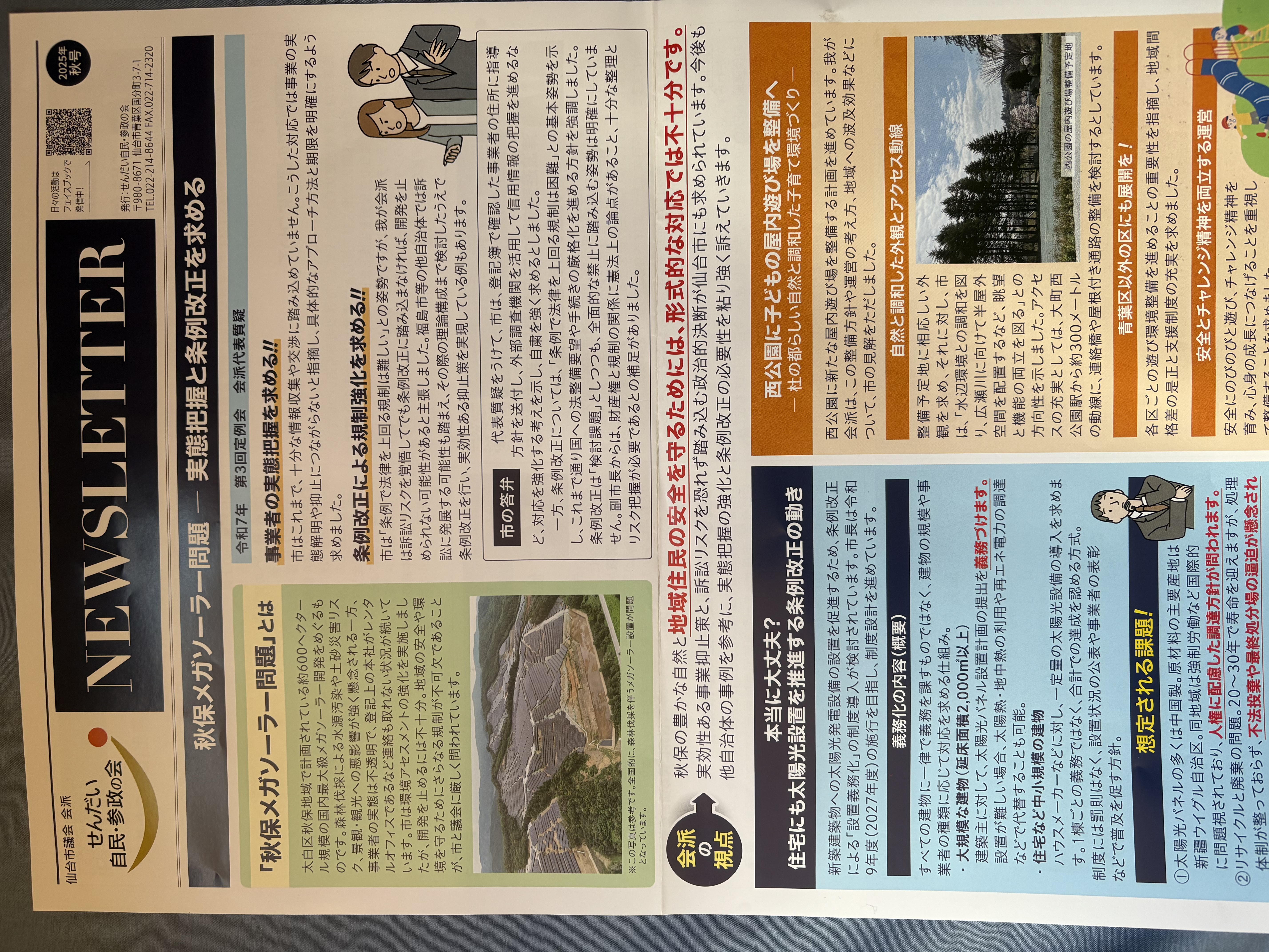 ● 参政党の大河原芙由子仙台市議会が所属する「せんだい自民・参政の会」では、今年第3回定例会の会派代表質疑で、再度秋保の件を取り上げ、①事業者の実態把握と②条例改正による規制強化を求めました。