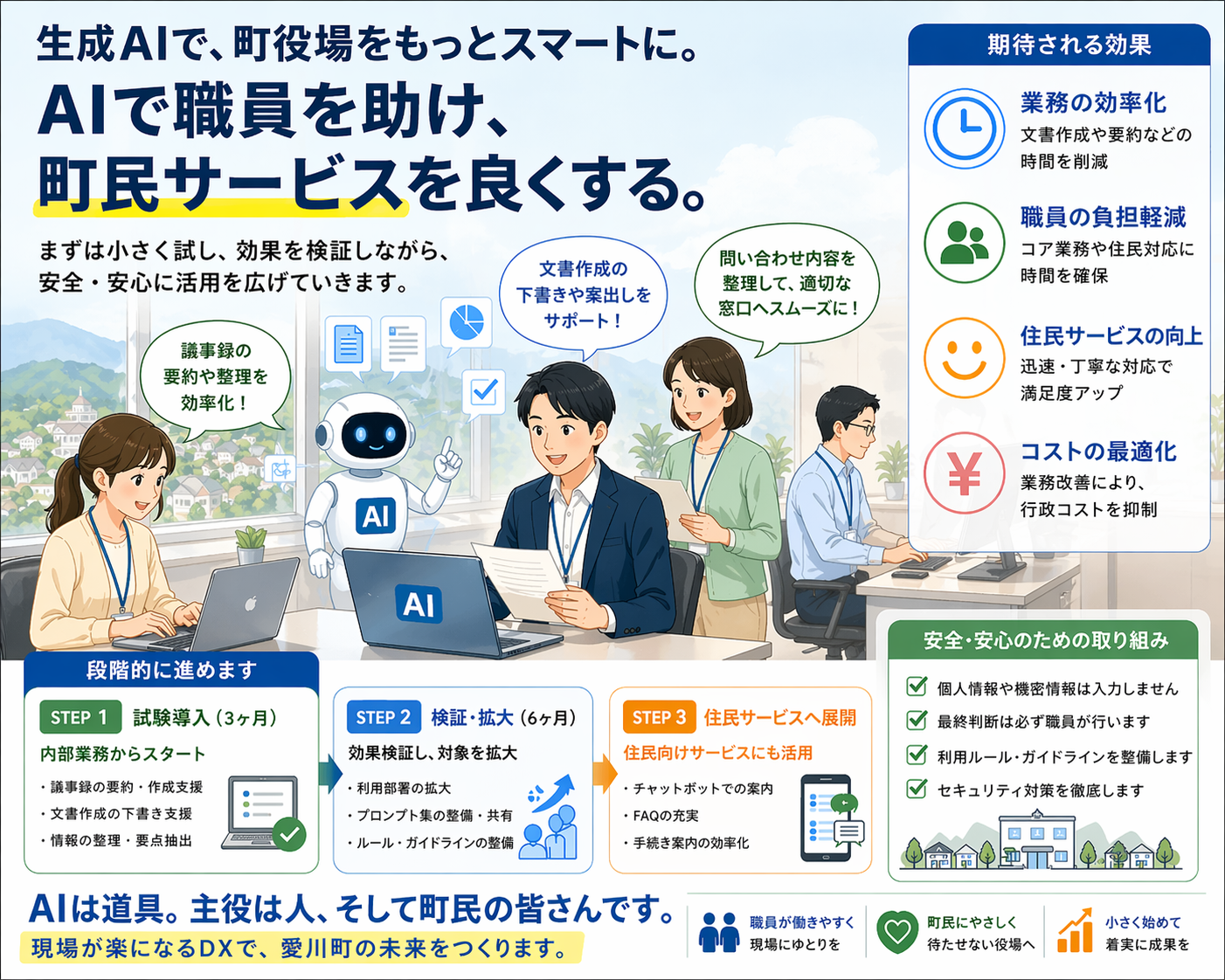 生成AIの活用は、町でも検討が始まっています。ただ大切なのは、“検討で終わらせないこと”。私はまず議事録や文書作成から試験導入し、結果を公開しながら広げていきます。“実行するDX”を進めます。
