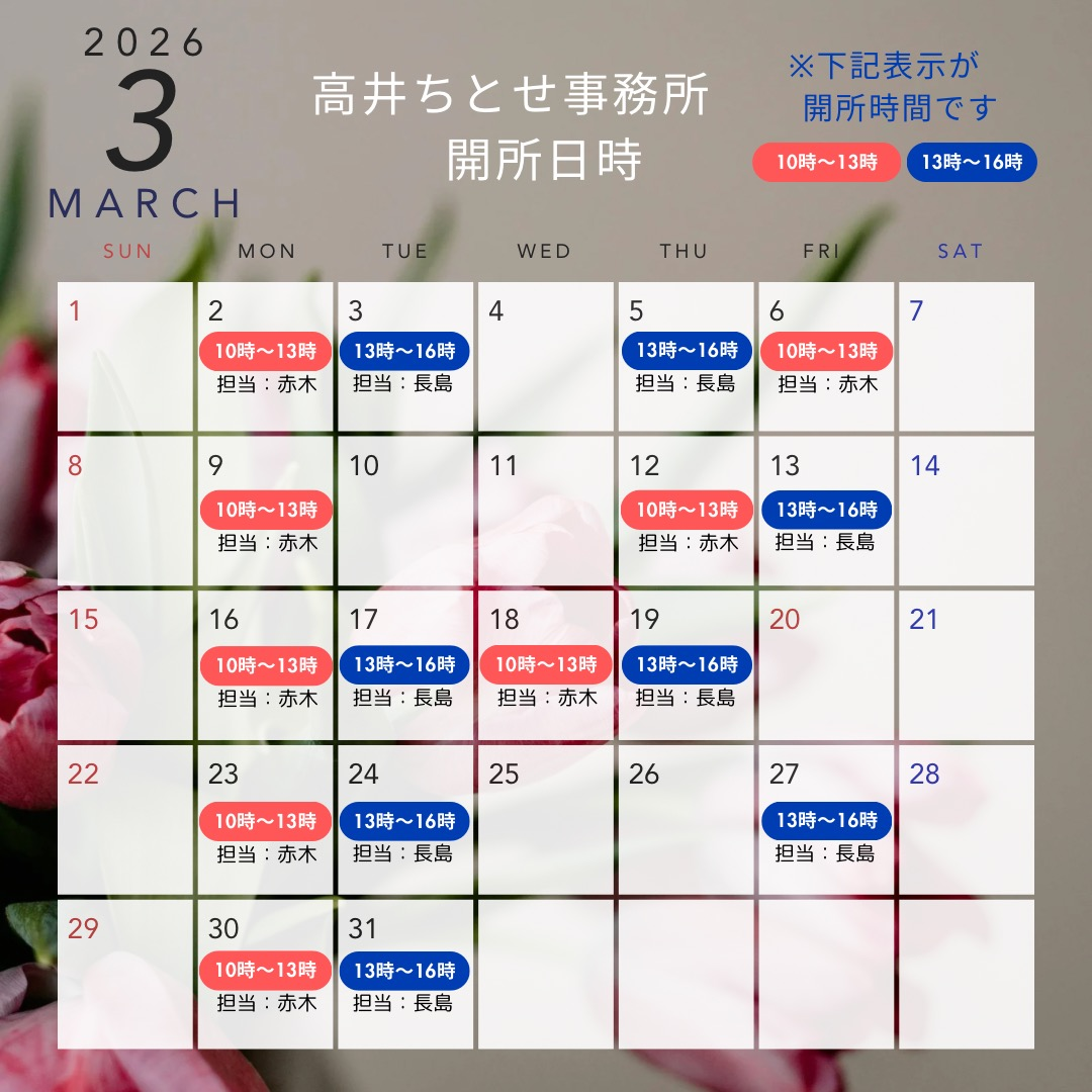 ホーム>政党・政治家>高井 ちとせ (タカイ チトセ)>【3月 事務所開所日時のお知らせ】
