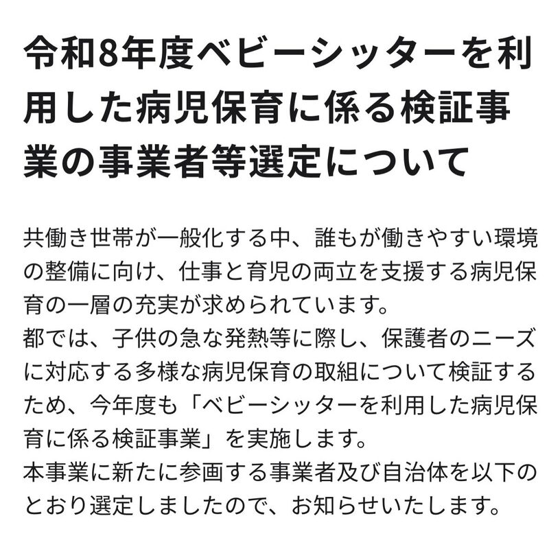 このたび、東京都が実施する「ベビーシッターを利用した病児保育に係る検証事業」に、調布市が参画自治体として選定されたとの発表がありました🎉