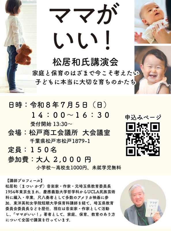 このたび、出版から3年を経た今なおAmazon福祉部門で上位紹介される書籍『ママがいい!』(https://amzn.asia/d/0e6VTlki)の著者である松居和さんを松戸にお招きし、講演会を開催する運びとなりました。