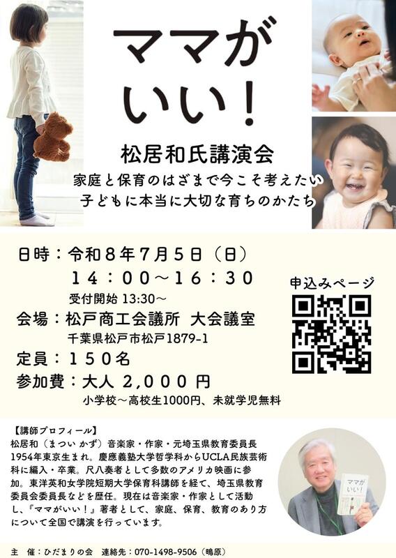 そして、7月5日には「ママがいい!」の著者である松居和さんをお招きして講演会を行います。