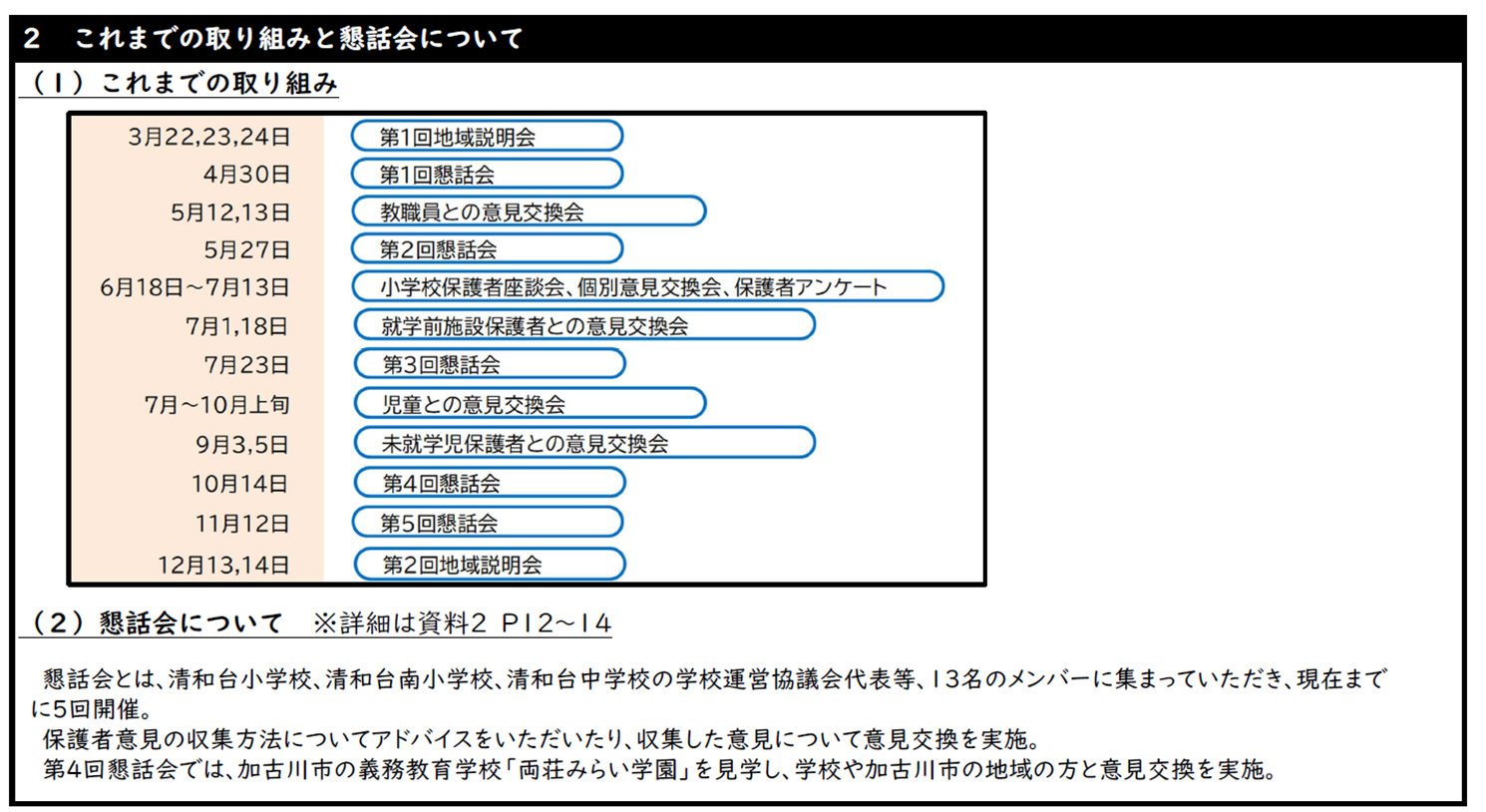 これまでの取り組みは地域説明会の実施や複数回の懇話会(関係者を中心としたメンバーを限定しての会)を実施していました。