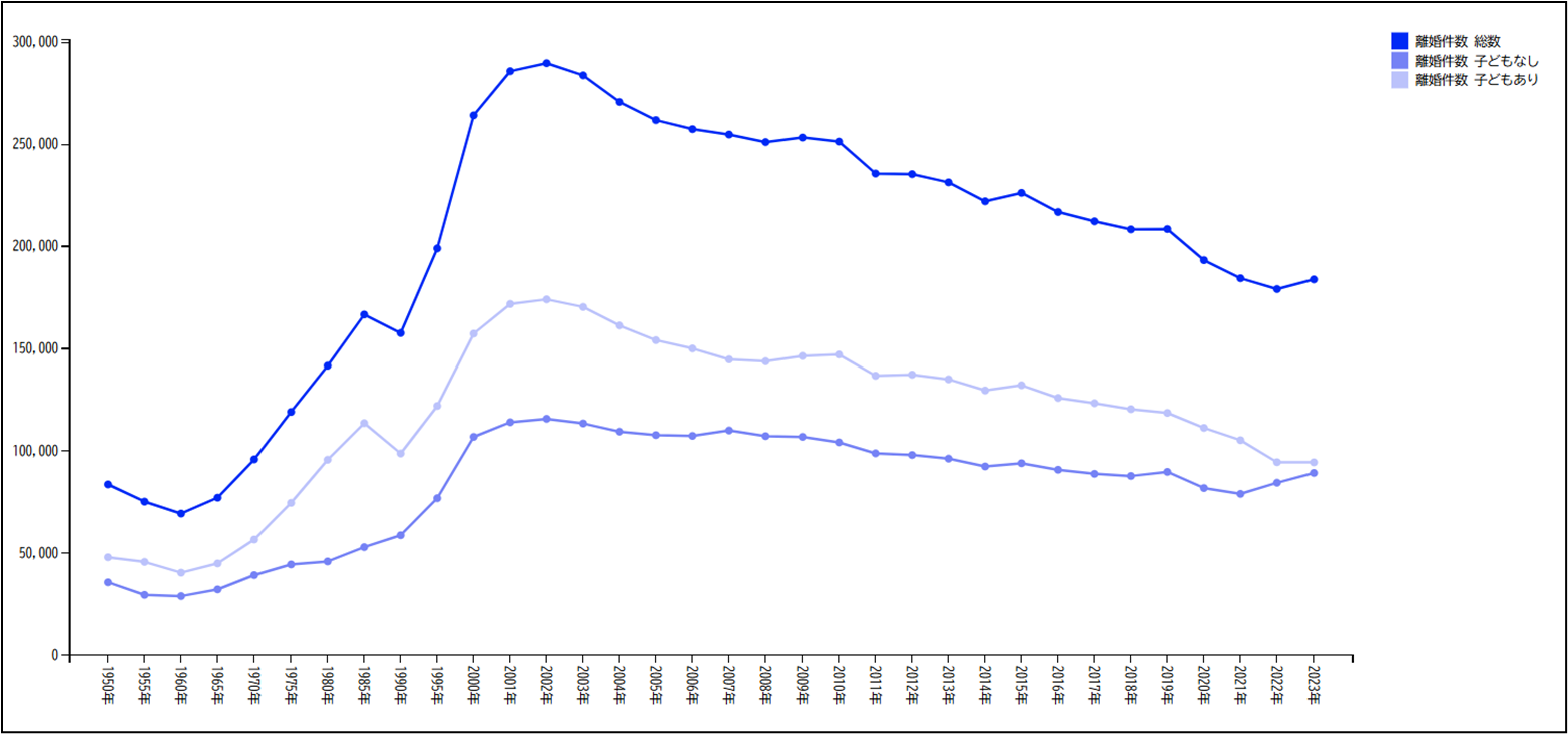 1995年頃から、価値観の転換や女性の社会進出といった社会変化により、離婚数は増加したとされています。