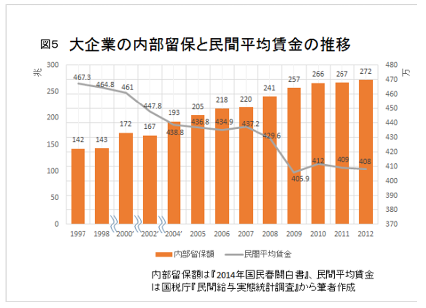 リーマン・ショック(2008年)により、「お金を持っておかないと倒産する」という危機感を企業が持つようになりました。いわば経営者の 恐怖感 ゆえに、内部留保は増え続ける一方、労働者への賃金は抑えられてきたのです。