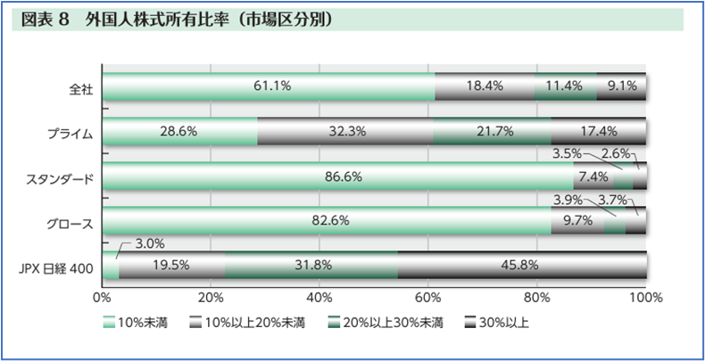 JPX日経400に入る企業は、超エリート企業。ここでは、外国人投資家の持株比率が半分近くに達するケースも多く見られます。3割以上で影響力があるとされますから、非常に外国の影響を受けているとも言えます。