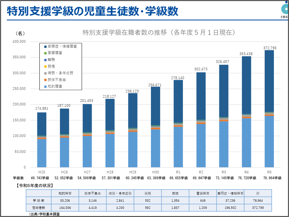 約17.5万人➡約37.3万人(特に自閉症・情緒障害学級の伸びが著しい)