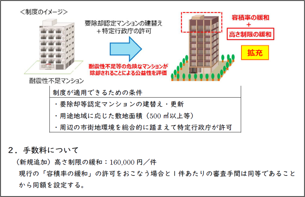 マンションを建て替える際に、高さ制限の緩和に関する審査が追加され、その手数料が新たに設定されました。