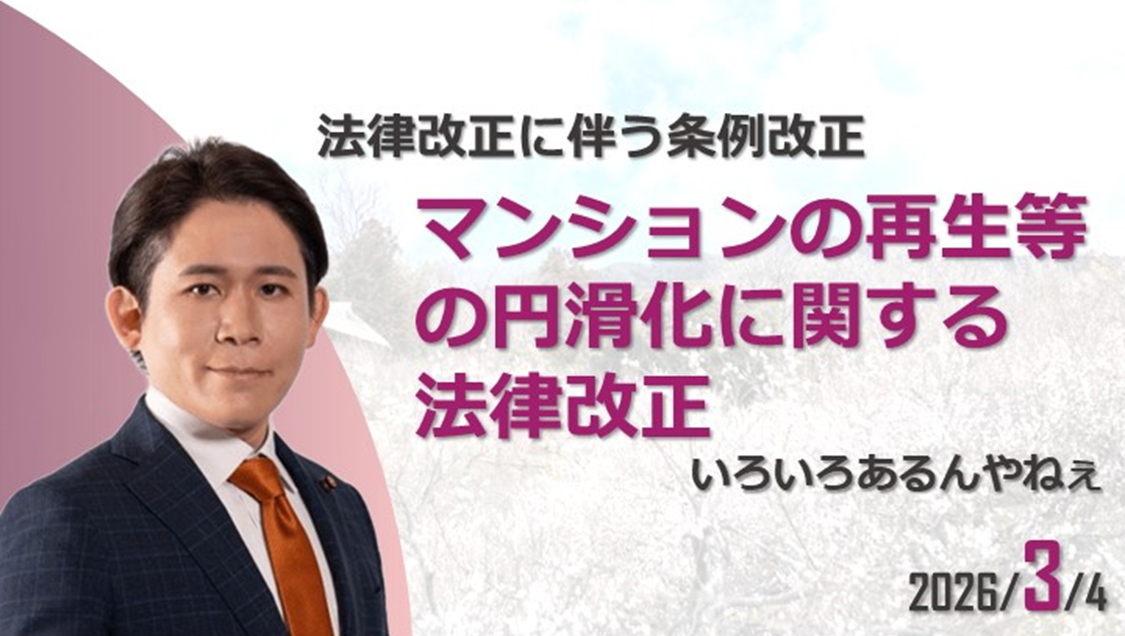 これまでの「マンションの建替え等の円滑化に関する法律」が、「マンションの再生等の円滑化に関する法律」に改正されました。それに伴い、本議会では条例改正案が提出され、建設委員会にて審議されました。