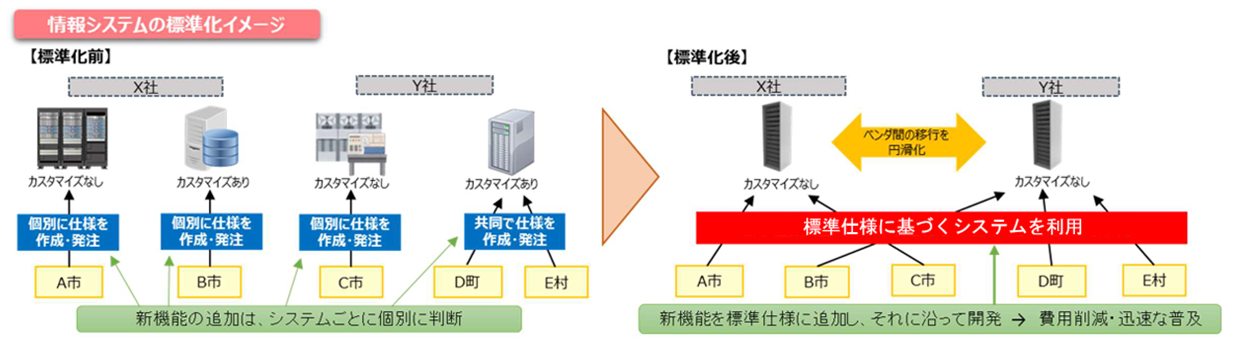 それまで自治体ごとに独自のシステムが構築されて、各々使いやすいように創意・工夫という名のカスタマイズが行われていました。しかしその一方、改修作業や市町間のデータ連携がスムーズにいかないという問題がありました(なんとなく想像がつく)。