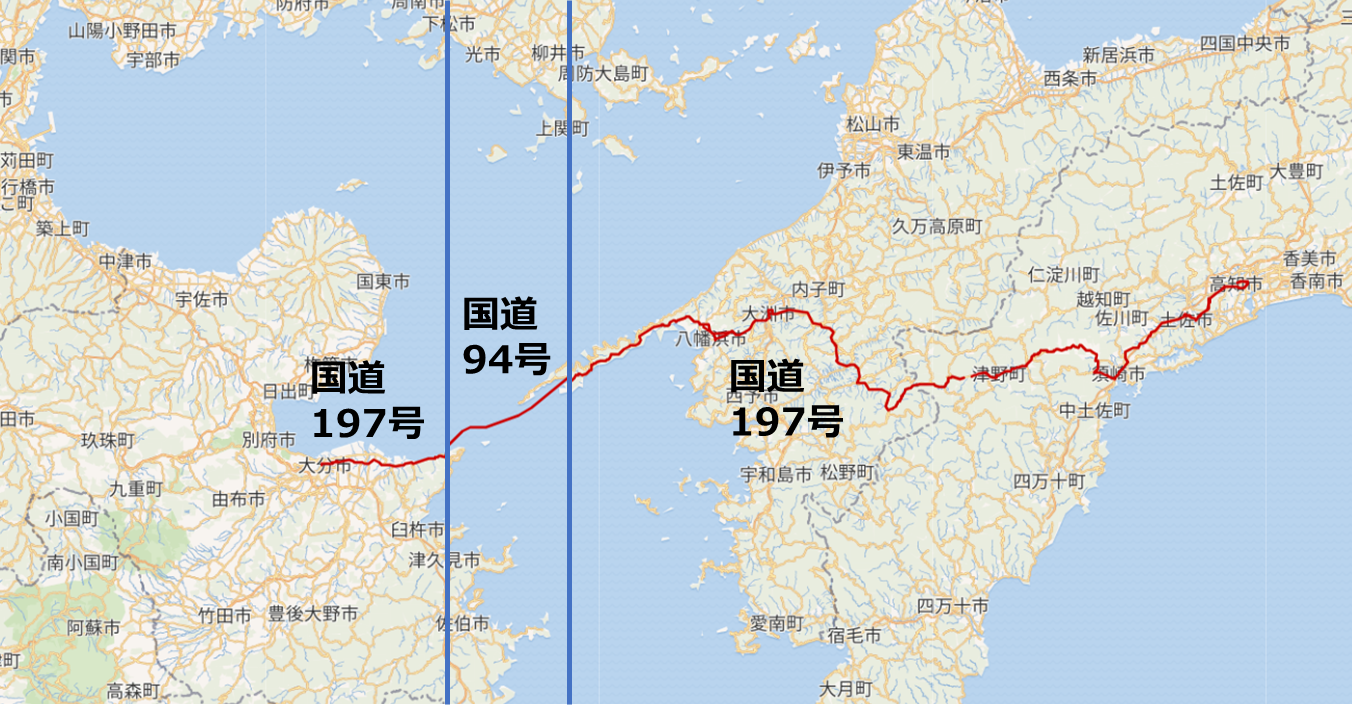 佐田岬半島から九州に行けるフェリーがあります(国道九四フェリー)。車もそこまで高くない運賃なので、九州に抜けちゃうのも旅行プランとしてはアリですね。国道197号を走れば、愛媛側(三崎港)に着きます。そこからフェリーで大分県(佐賀関港)まで向かうと197号が続きます。
