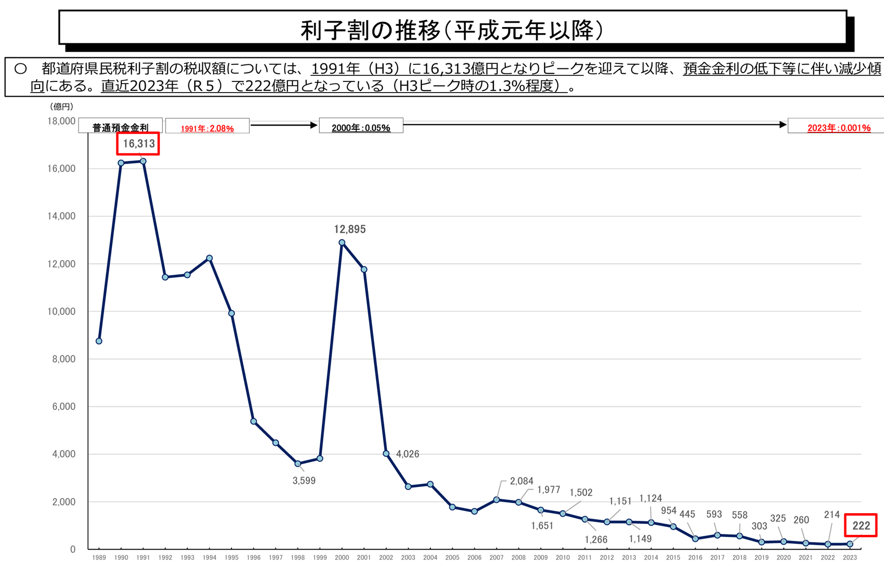 これは都道府県税なのですが、銀行は東京・大阪など都市部に集中しています。そのままだと税収が都市部に偏ってしまうため、銀行が源泉徴収した税金を一旦国に納め、そこから都道府県に配分されます。そして、その一部が「利子割交付金」として市町村に交付される仕組みです。