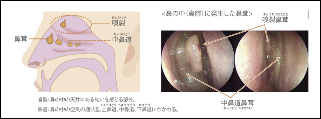 この鼻腔粘膜の一部が膨らみ、まるでキノコのように見えるのが鼻茸(鼻ポリープ)です。鼻づまりを起こし、ステロイド点鼻薬によって小さくはなりますが、完全に消失することまれで、ひどい場合は外科的手術を行います。