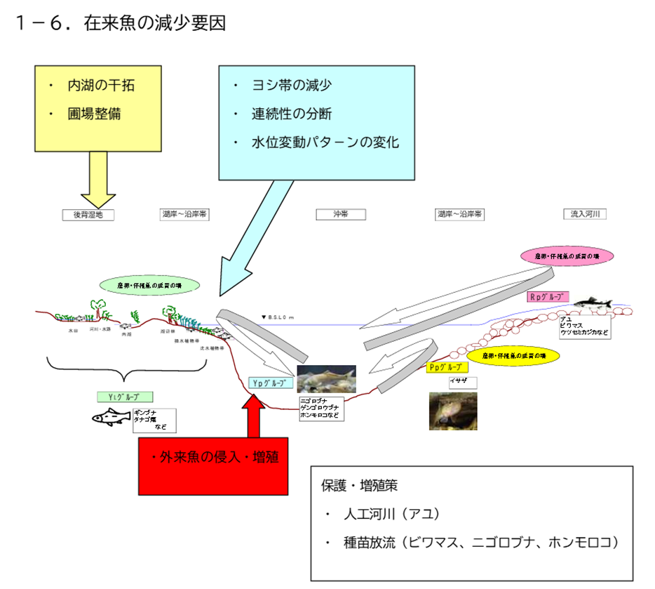 つまり、ヨシ帯の減少と外来種の急増によって、在来種であるコイなどが大幅に減少しているのです。